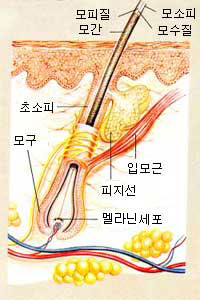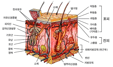 µÎÇǴ ǥÇÇ(epidermis), ÁøÇÇ(dermis), ÇÇÇÏÁ¶Á÷(subcutaneous tissue)À¸·Î ±¸¼ºµÇ¾î ÀÖÀ¸¸ç °¡Àå ¹Ù±ùÁ¶Á÷ÀÌ Ç¥ÇÇÀÌ´Ù. Ç¥ÇÇ´Â ½ÅüÀÇ ¹Î°¨ÇÑ Á¶Á÷À» ¼Õ»ó¹ÞÁö ¾Êµµ·Ï º¸È£ÇØÁÖ´Â ±â´ÉÀ» ¼öÇàÇϴµ¥, ÀÌ¿Í °°Àº ±â´ÉÀº Äɶóƾ(keratin)À̶ó´Â ¹°Áú·Î ±¸¼ºµÇ¾ú±â ¶§¹®ÀÌ´Ù. |